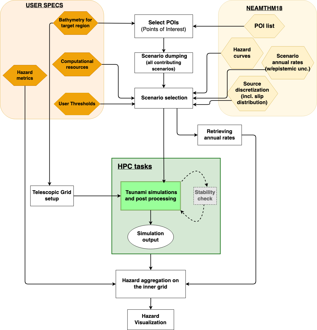 The workflow aims at computing PTHA at a local scale for a given target site, starting from a regional hazard model, presently NEAMTHM18, that is the long-term hazard model for the NEAM region (North-East Atlantic, Mediterranean and connected seas). One target site is allowed for the moment, future upgrades will allow to process more than one.